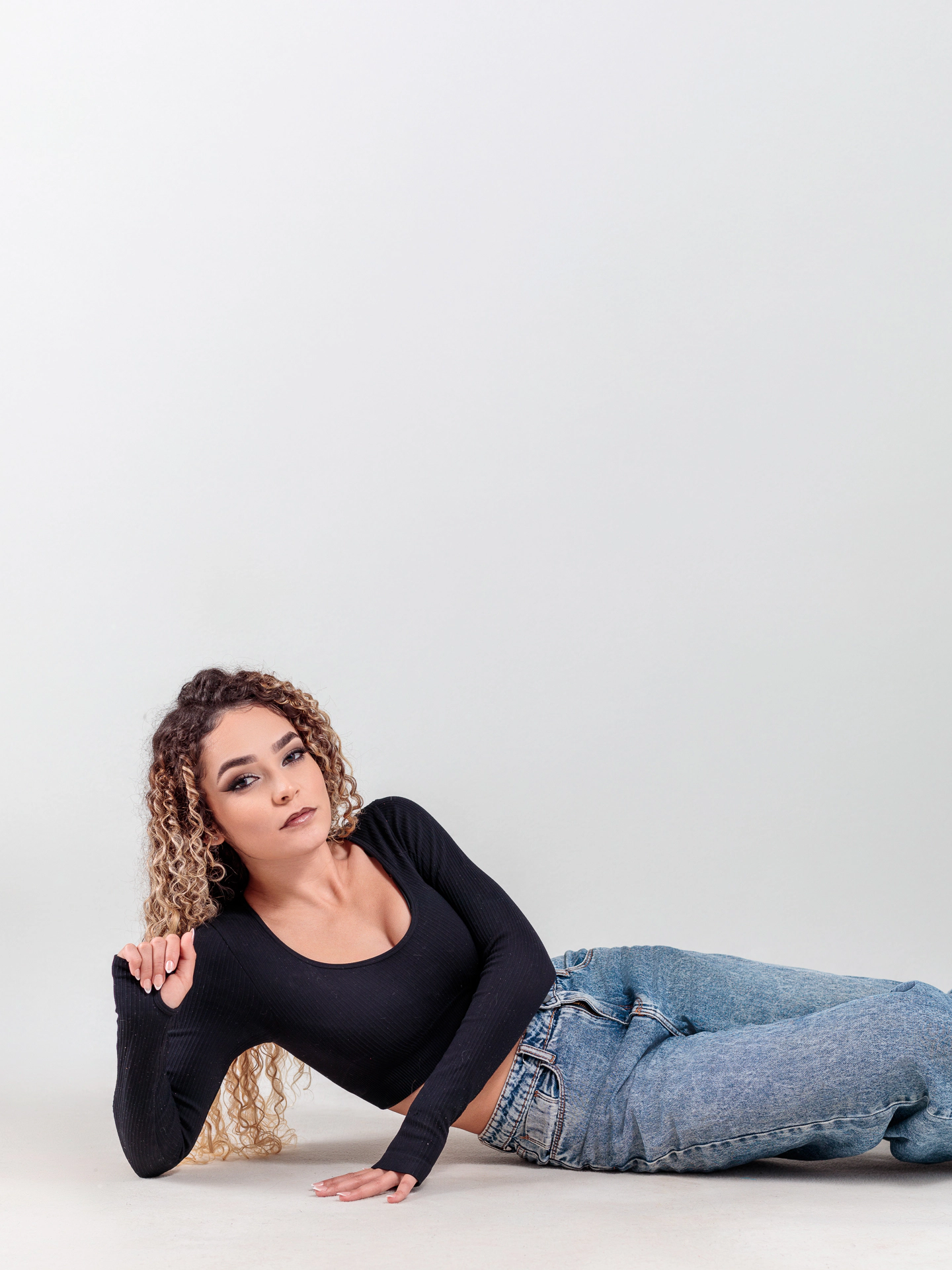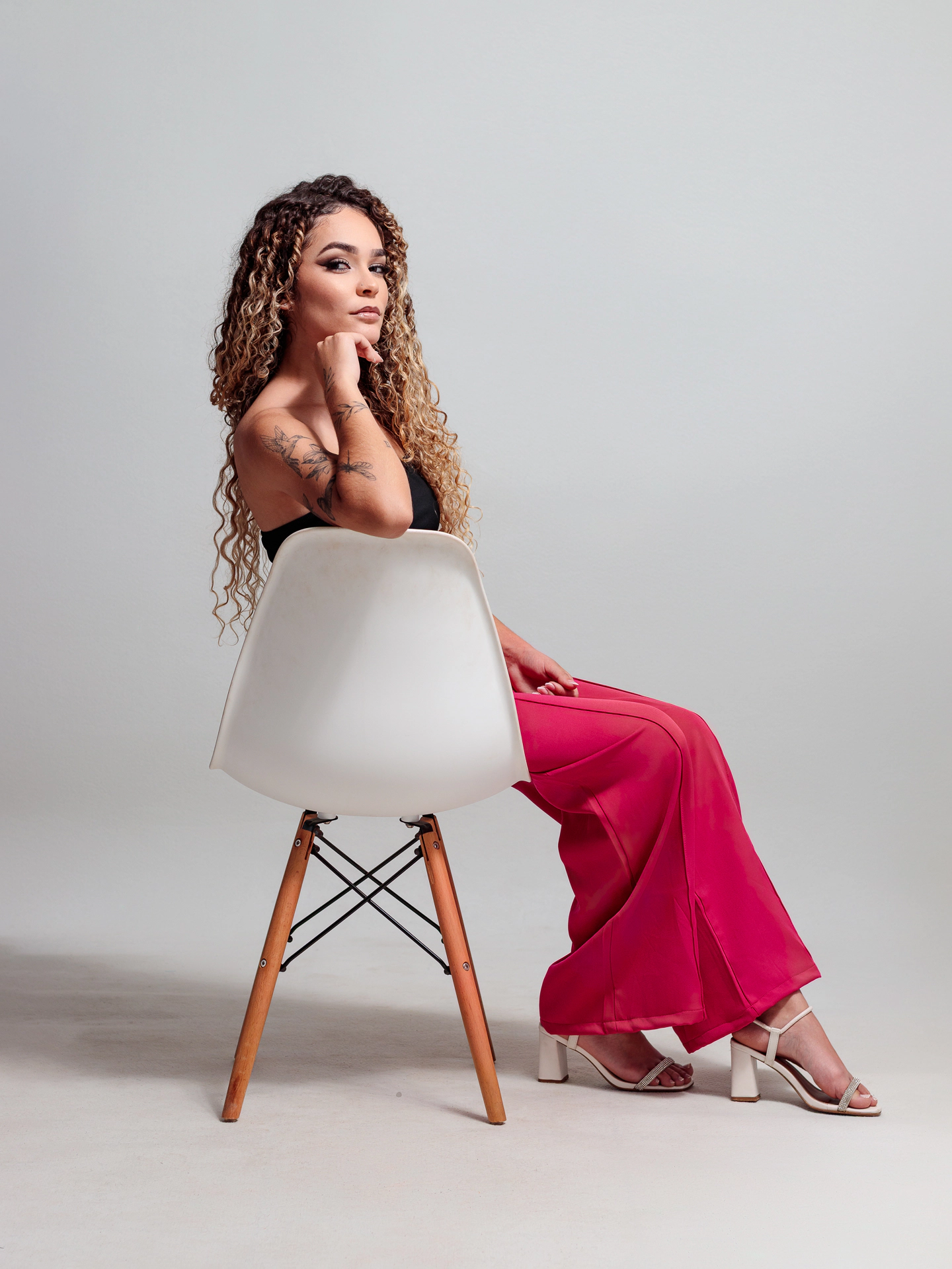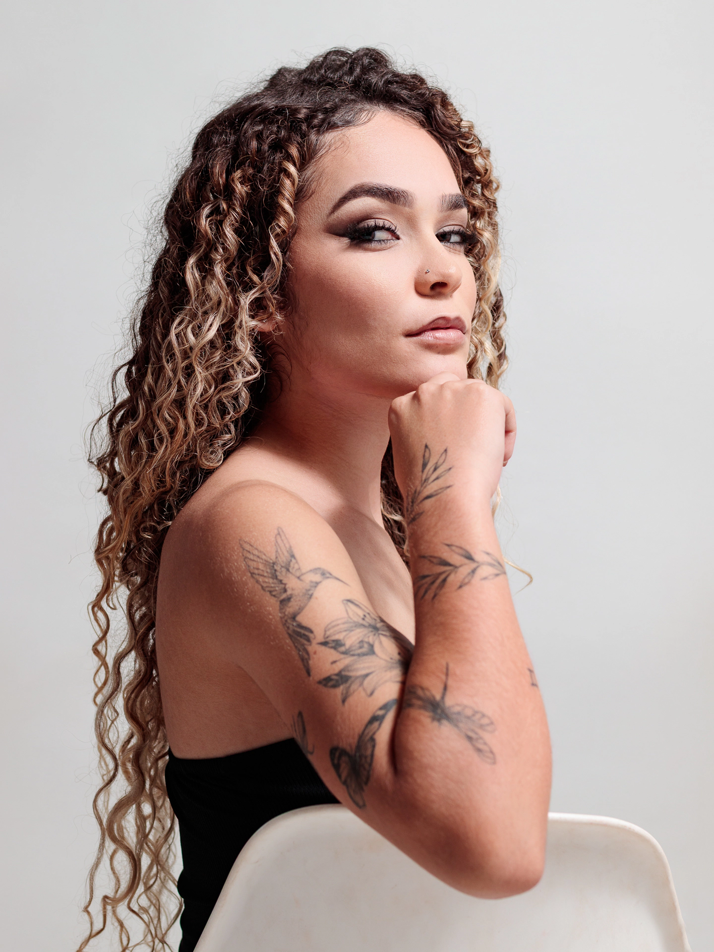 Um ensaio fotográfico moderno, minimalista e cheio de autenticidade. A suavidade do fundo neutro valoriza ainda mais os detalhes da modelo, trazendo destaque para sua expressão confiante, os traços delicados e a beleza natural.