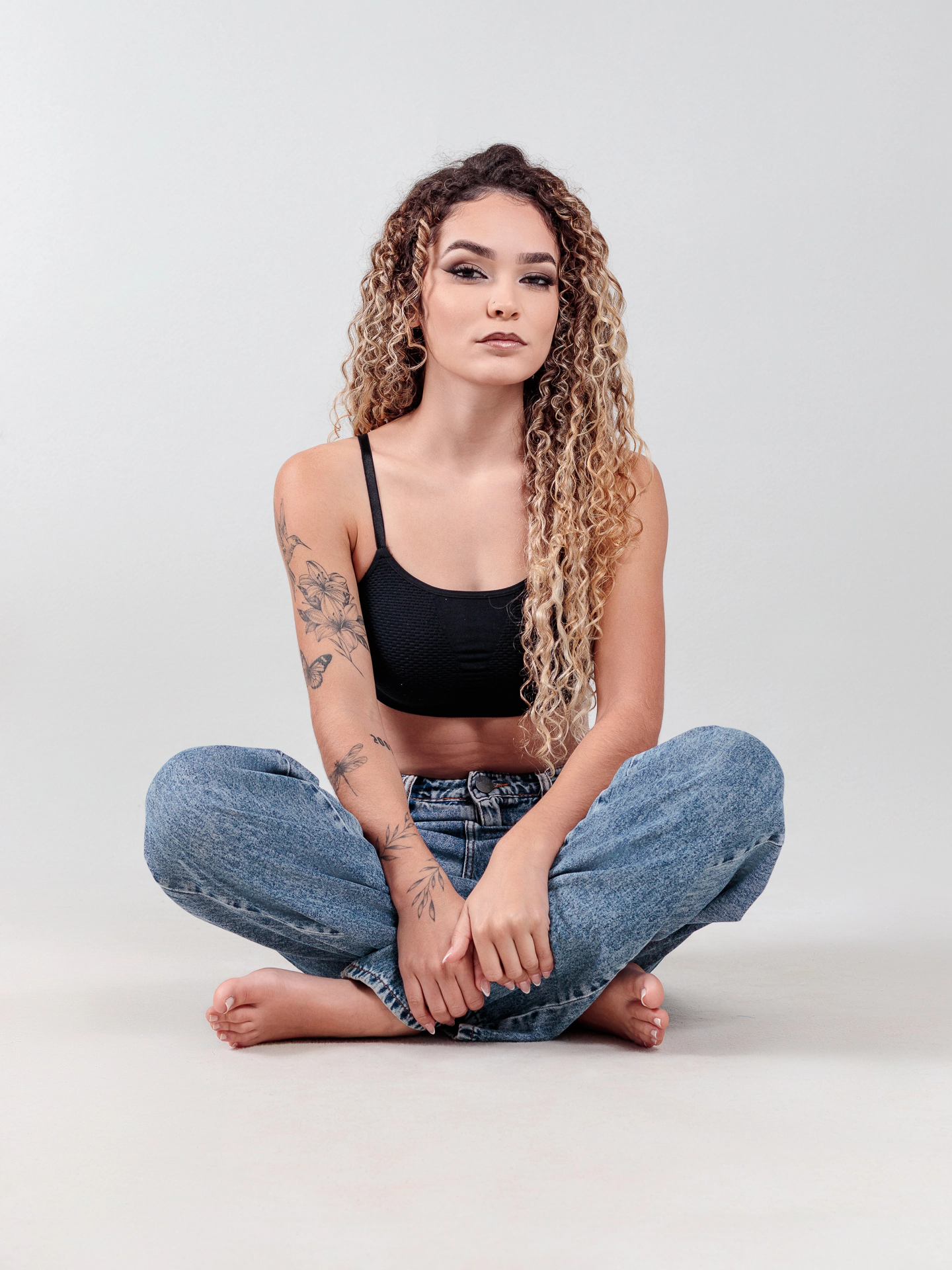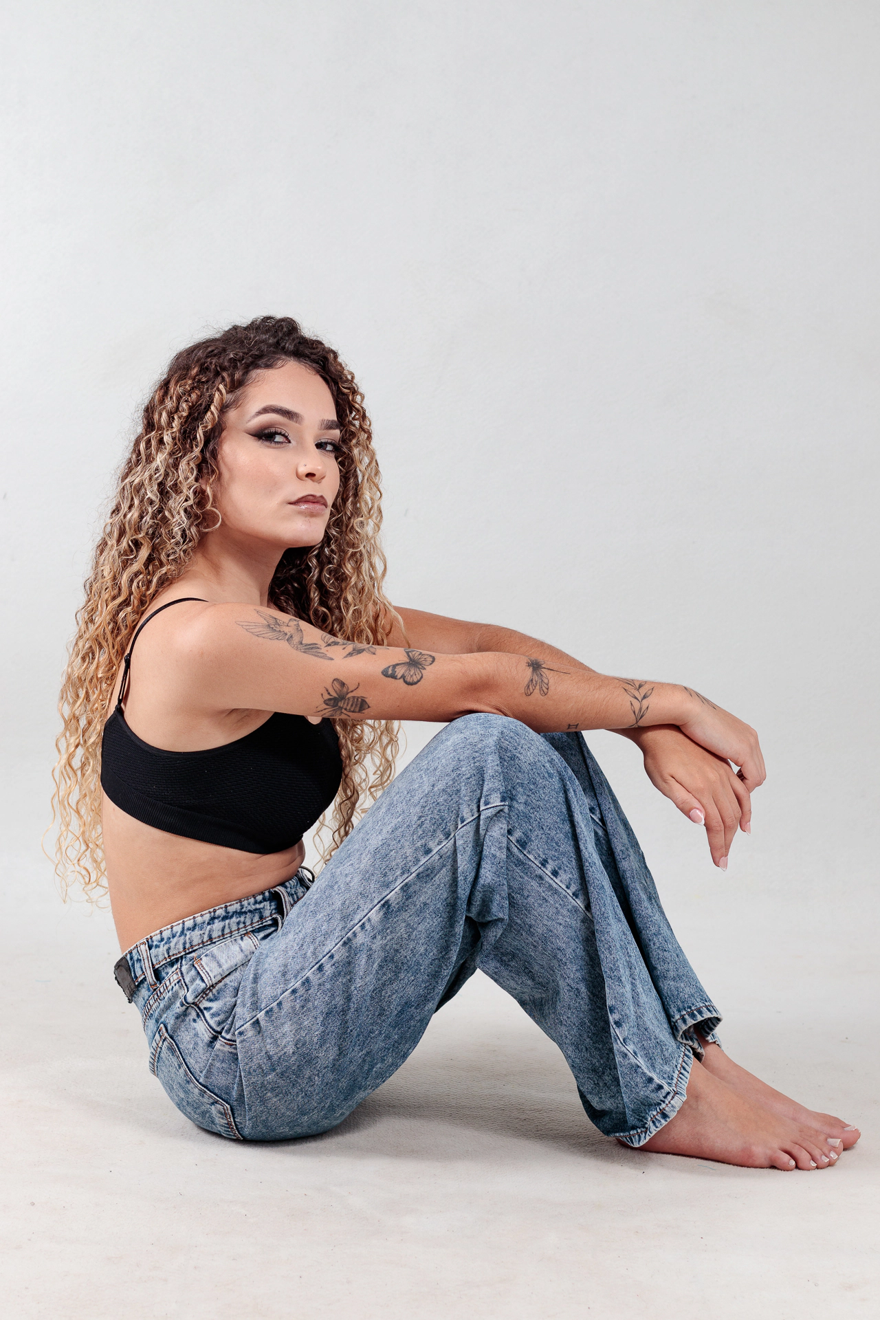 O contraste entre o preto elegante do look e o jeans despojado cria uma atmosfera atemporal, perfeita para transmitir personalidade, estilo e atitude. As tatuagens, com seus desenhos de natureza e liberdade, adicionam identidade única e reforçam o tom artístico das imagens.