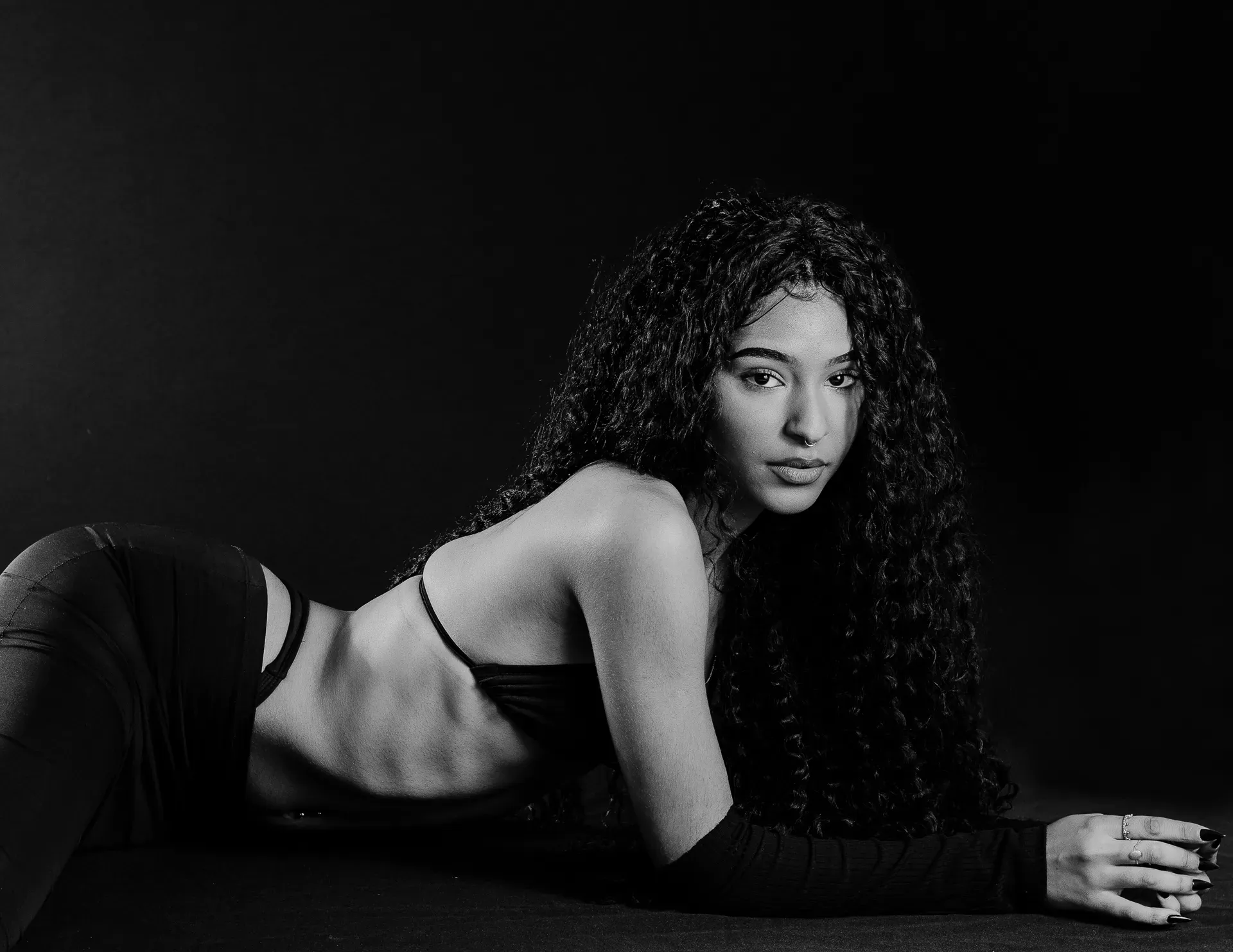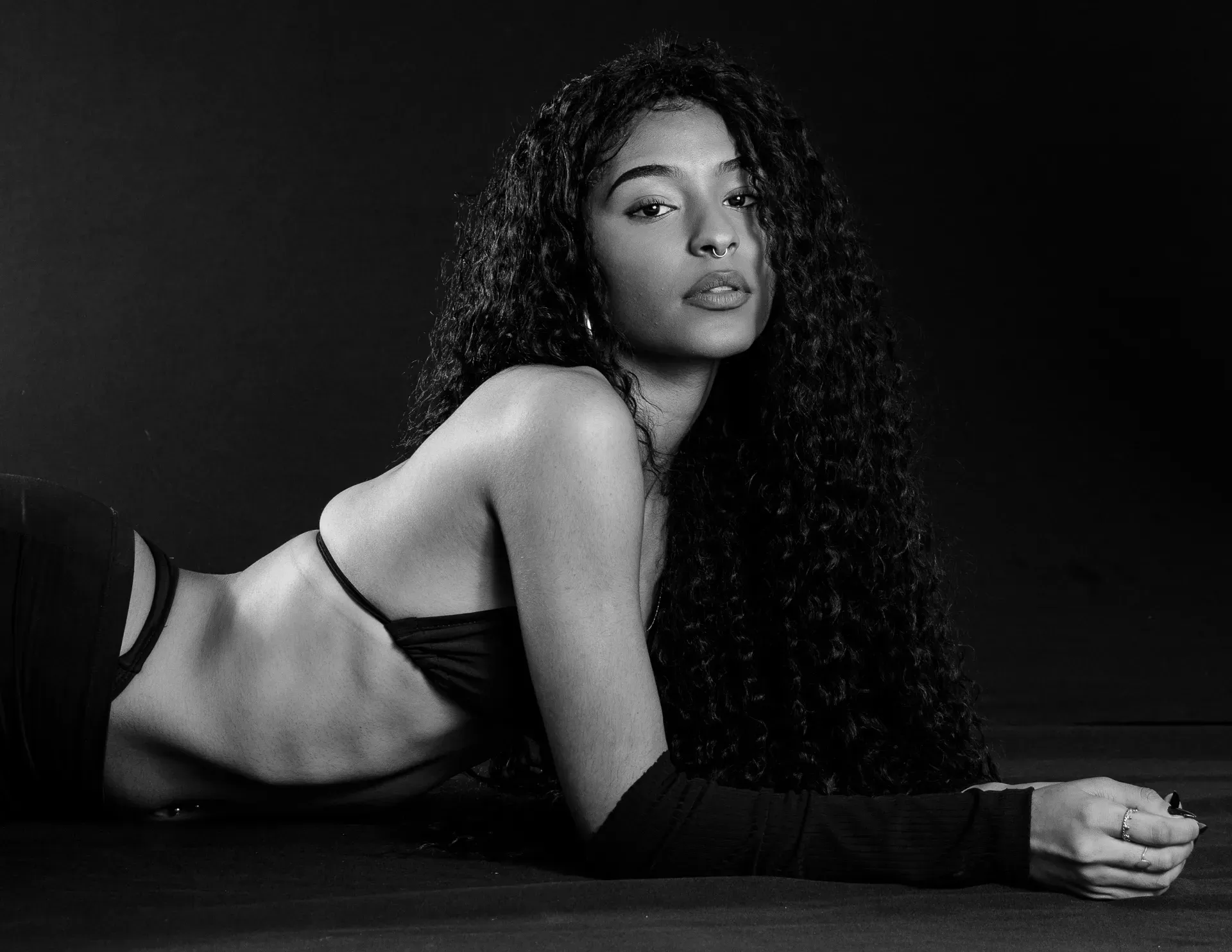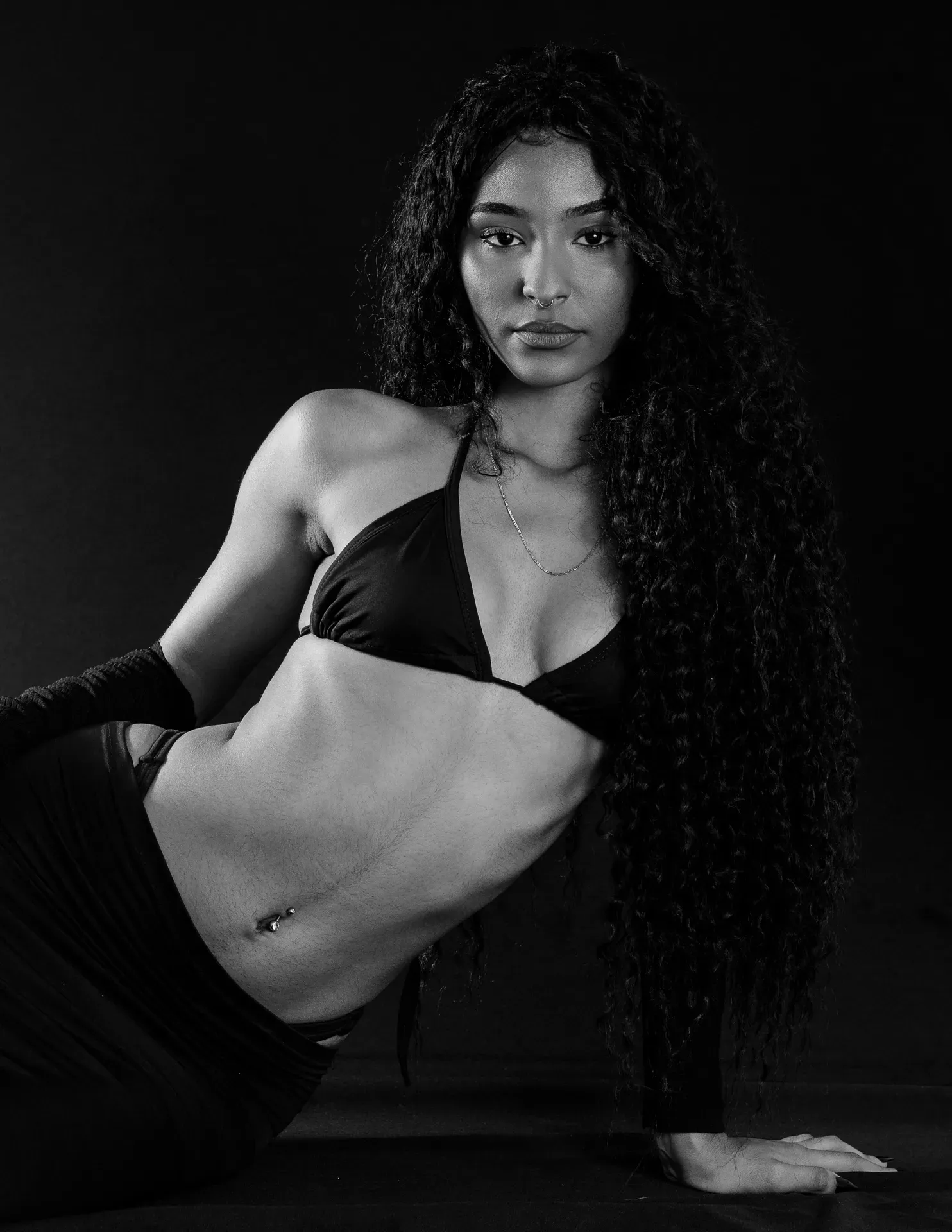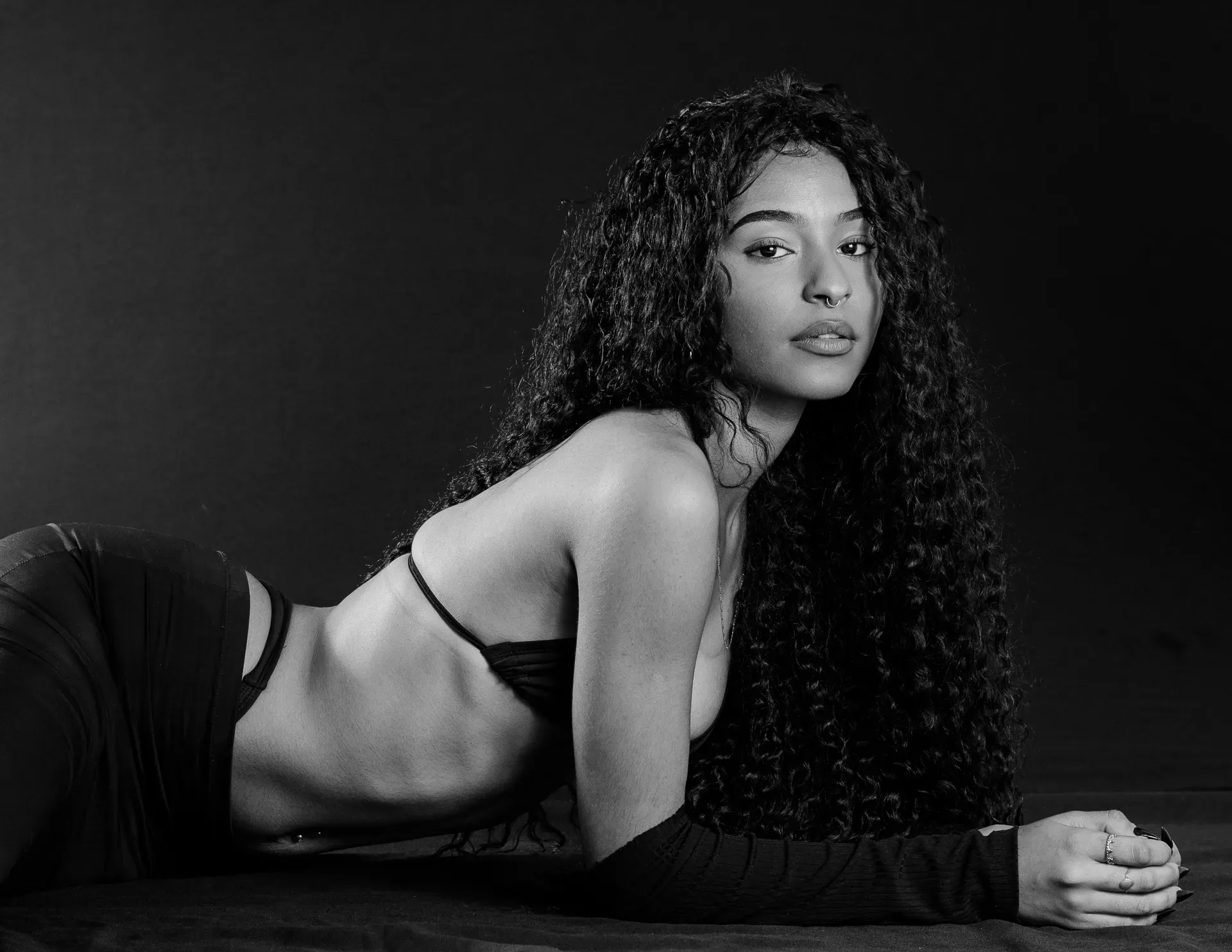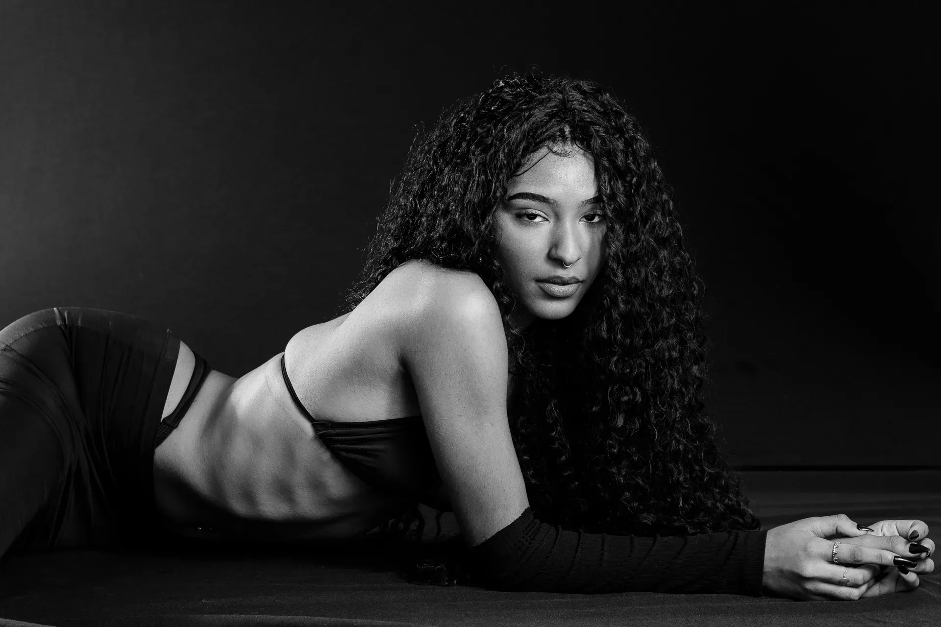 Neste ensaio, buscamos destacar toda a elegância e versatilidade de Evilyn Alves, utilizando o minimalismo do fundo preto para realçar sua presença e expressão diante das lentes. A simplicidade do cenário contrasta com a riqueza de detalhes capturados, dando enfoque total à beleza e à postura da modelo.