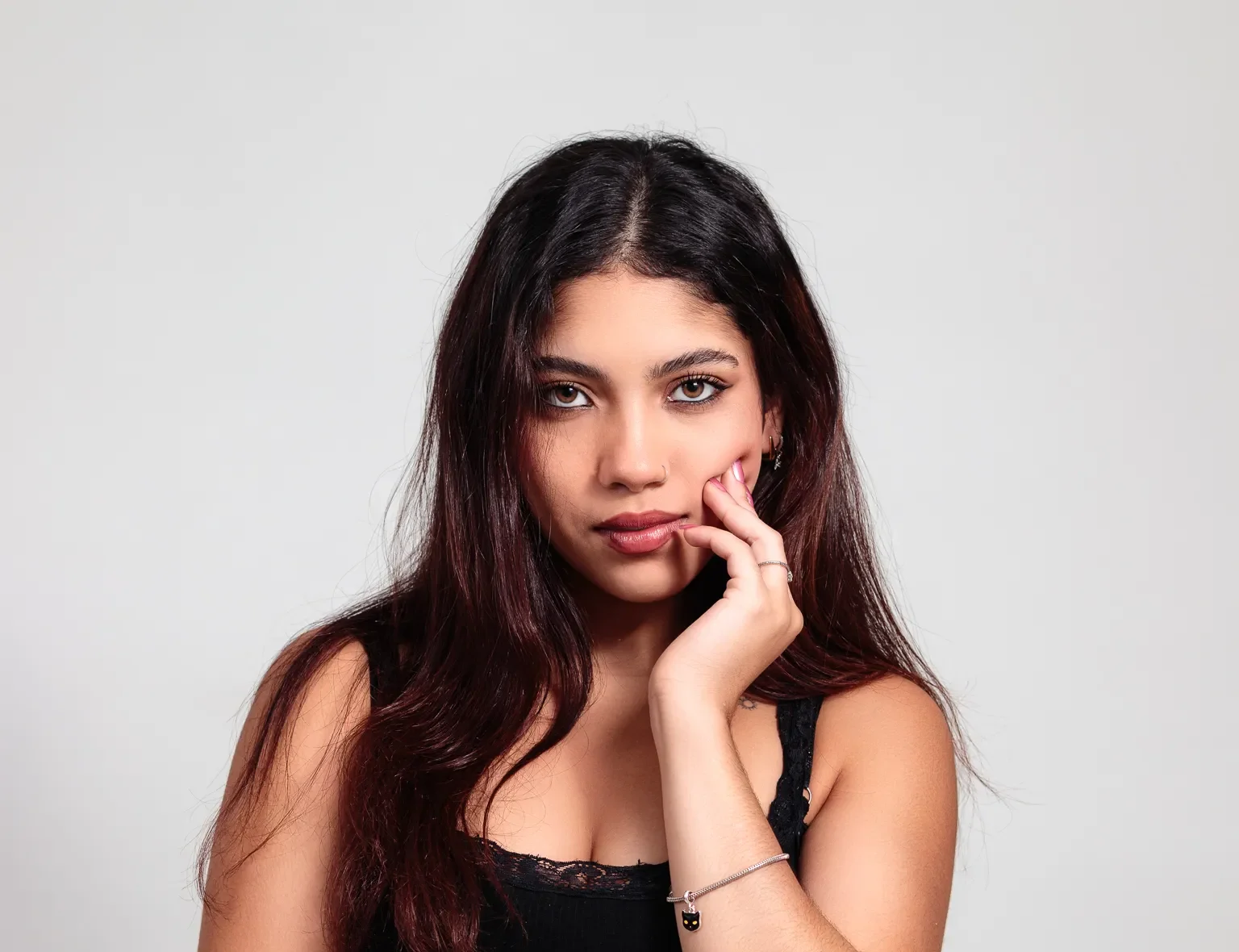 Acessórios marcantes: anéis minimalistas e prata, pulseira fina com pingente de gatinho, piercing de aro no nariz e ear cuffs dourados completam o visual.