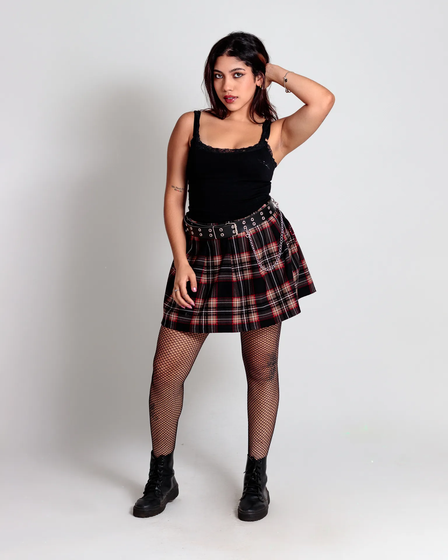 Look grunge & girlie: regata preta canelada com aplicação de renda no decote, saia xadrez vermelha e preta em tecido leve com pregas, cinto de ilhoses e corrente metálica, meias arrastão e boots de couro.