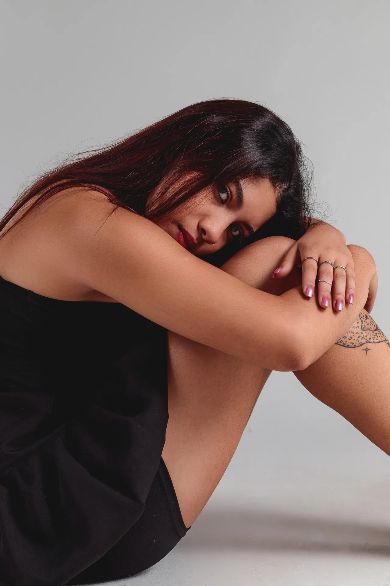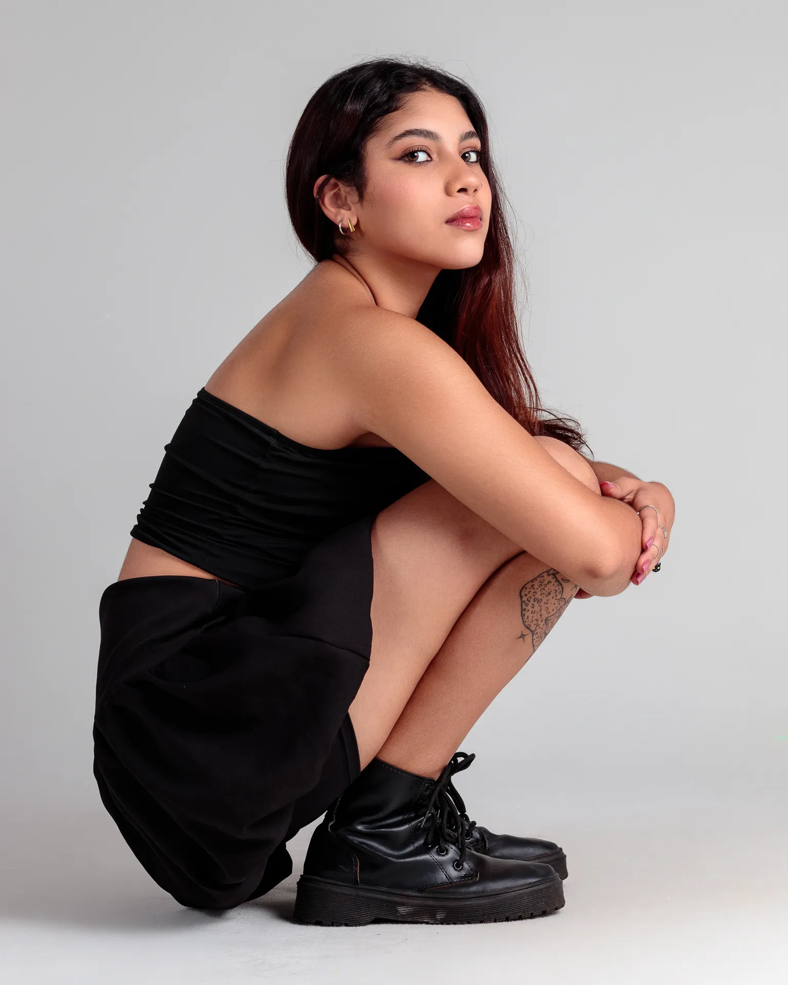 Descubra a essência deste ensaio: uma jornada de atitude e feminilidade, capturada em cenários neutros e contrastes dramáticos.